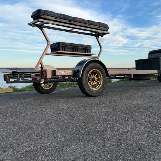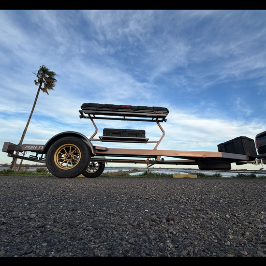 The FTK Lefty comes standard at 18’ total length and 78” total width. Includes bow box with wired marine grade light switches and chargers, 4 auxiliary lights mounted on the upper platform as well as a 9” led light bar for backing down on those dark tournament mornings. 2 cargo buckles keeping your kayak secure on those long trips from lake to lake, 15” aluminum wheels and radial tires rated at 81mph plus, 15” steel spare, 44” or 36” bow box. With many many more options to list.